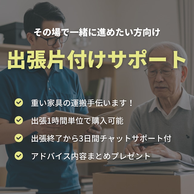 「直接見てもらいながら進めたい」 「誰かと一緒なら片づけられる」 「オンラインじゃ伝わらない部分もある…」 「重いものを片付けるのに一人じゃ作業できない…」 そんなあなたに向けた出張サポートです! 【あなたの人生が1gでも軽く、もっと快適になる】 その最初の一歩を、ご自宅で直接サポートいたします! ■ サービス内容・料金 出張サポートプラン:3,000円/1時間 - ご自宅での片付けサポート 1時間分 - 1時間単位追加購入可能(3,000円/時間) - 広島市内を中心としたエリア対応 - 現地で実践しながらレクチャー ※広島市以外は別途交通費がかかる場合があります ■ サービスの流れ STEP 1|商品購入 - BASEであなたに最適なサービスプランをご購入 STEP 2|公式LINE登録 - 以下のリンクから公式LINEアカウントに登録 【LINE登録リンク】https://lin.ee/TvPfFeE STEP 3|サービス予約 - トークメニューの「ご予約」をタップ - ご購入いただいたサービスの「このサービスを予約する」をタップ STEP 4|ヒアリング・作戦会議 - 事前質問事項にご回答 - お悩みの場所や片付けの課題をヒアリング - 最適な進め方を一緒に計画 STEP5|現地でのサポート【60分~】 - ご自宅の状況を直接確認 - 一緒に作業しながら「残すor捨てる」判断をサポート - その場で具体的な片付けのコツをレクチャー STEP6|継続フォロー【最終チャット3日間】 - 進捗報告や写真相談でモチベーション維持 - リバウンド防止のコツもお伝え ■ 11年のミニマリスト経験で提供するもの - あなたの性格・ライフスタイルに合わせたオーダーメイドアドバイス - モノを減らすだけでなく『あなた自身が自分で片付けられるようになる』ためのミニマリスト直伝マインドセットや習慣づくりもサポート - 「捨てられない」気持ちに寄り添う心理面フォロー ■ 出張サポートならではのメリット - 実際の収納スペースや動線を見ながら最適なアドバイス - その場で疑問や迷いを即座に解決 - 一緒に作業することでモチベーション向上 - ご自宅の特徴を活かした具体的な整理方法をご提案 ■ こんな方におすすめ ・自宅で一緒に片づけてほしい ・手が止まる場所を具体的に見てほしい ・短時間で効果的に整えたい ・モノが多すぎて一人では無理だと感じている ・オンラインよりも対面が好み ・広島近郊にお住まいの方 まずはお気軽にメッセージをお送りください! あなたの「理想の暮らし」への第一歩を、ご自宅で直接サポートいたします!